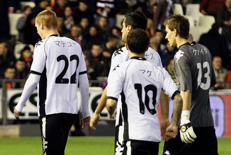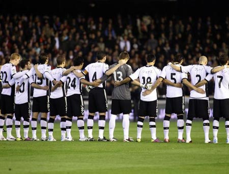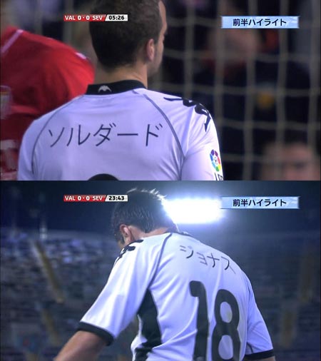 選手たちが日本語ネームを入れたユニフォームを着用 2011/03/21(Mon) セビージャ戦でバレンシアの選手たちが被災された方たちへの思いをこめて、日本語(カタカナ)のネームを入れたユニフォームを着用し、戦いました。 試合開始前には震災でお亡くなりになった方々へ一分間の黙祷が捧げられました。